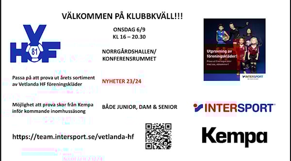 Klädprovning!!! Onsdag 6/9 kör vi tillsammans med Intersport & Kempa en klubbkväll. Finns möjlighet att prova träningsoverall, tränings set & skor. Information om vår webbshop & Intersport kundklubb från säljare på plats. Den nya kollektionen kommer att finnas för provning i butiken och att köpas i webbshoppen under hela säsongen. Vi försöker fördela oss lite 16.00-17.30 Handbollskolan, F9/10, P9/10, P11 17.30-18.30 F11/12,F15/16 18.30-20.30 P12/13, F13/14, F19, Ledare Vi ses i konferensrummet i Norrgårdshallen
