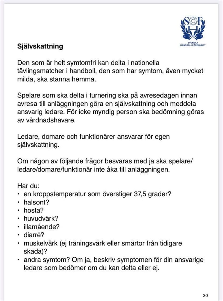 Snälla föräldrar!!! Hjälp oss minska smittspridningen och låt oss hoppas barnen får träna & spela så länge som möjligt. För att detta ska fungera behöver vi er hjälp med att inför varje samling göra självskattningen ( se bild ) och att ni vuxna INTE följer med in i hallen/läktaren. Vi önskar att ni lämnar av barnen UTANFÖR , vill man ha hjälp in så kontaktar ni er ledare. Följ löpande info på vår hemsida vad som gäller vidare. Så håll avstånd, tvätta händerna och visa era medmänniskor respekt Mvh Styrelsen Vetlanda Hf Vetlanda HF 2 nov 2020 0kommentarer