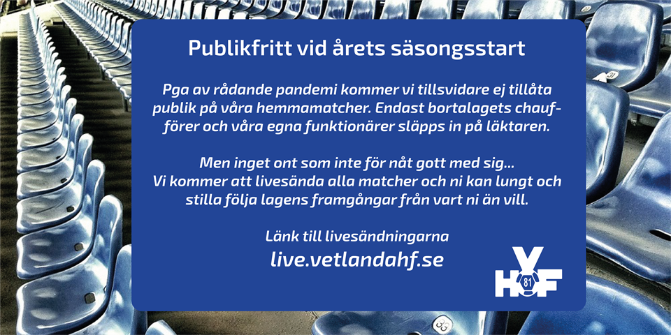 Detta gäller tillsvidare och kan komma att förändras under säsongen. Följ våra livesändningar, premiär nu på fredag. Du hittar våra sändningar här: live.vetlandahf.se Vetlanda HF 29 sep 2020 0kommentarer