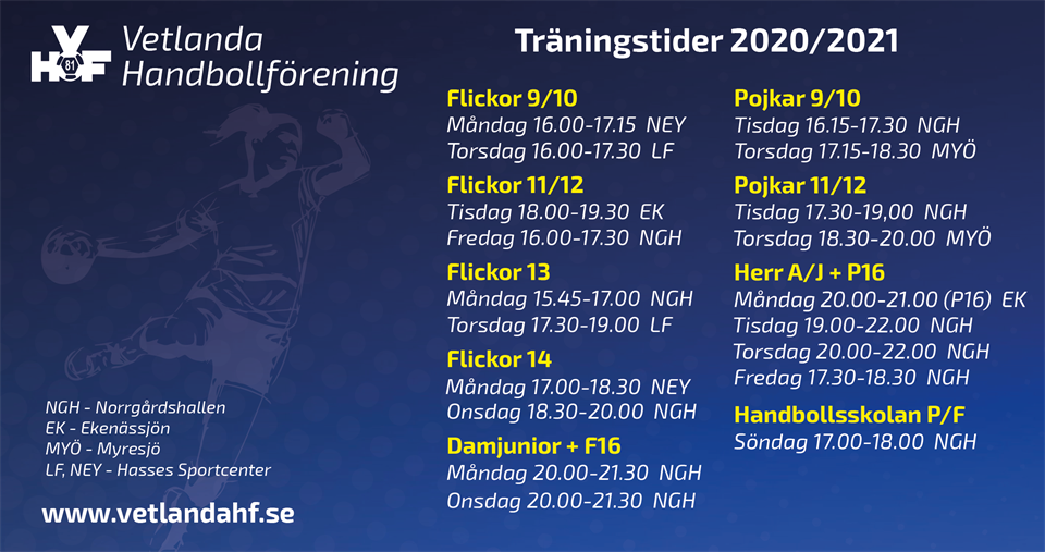 Nu är dag/tid och plats för säsongens handbollsträningar spikade. Besök respektive lags sida för mer information om startdatum och kontaktuppgifter till ledare. Välkomna alla nya och gamla spelare till en härlig handbollshöst! Vetlanda HF 27 aug 2020 0kommentarer