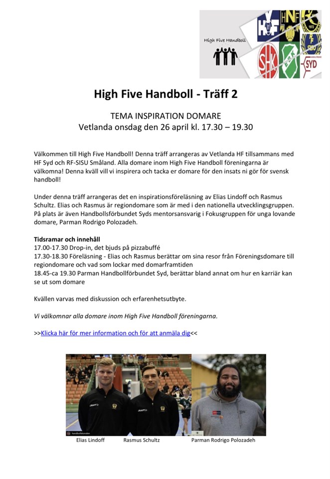 Vi bjuder in till inspirationsträff & föreläsning för våra domare 26/4 Välkommen med din anmälan https://educationwebregistration.idrottonline.se/home/index/1741892 Vetlanda HF 11 apr 2023 0kommentarer