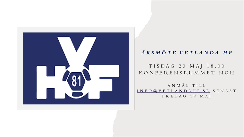 Alla medlemmar är Välkomna på årsmöte 23 Maj 18.00 konferensrummet i Norrgårdshallen Anmälan på info@vetlandahf.se Vetlanda HF 28 apr 2023 0kommentarer